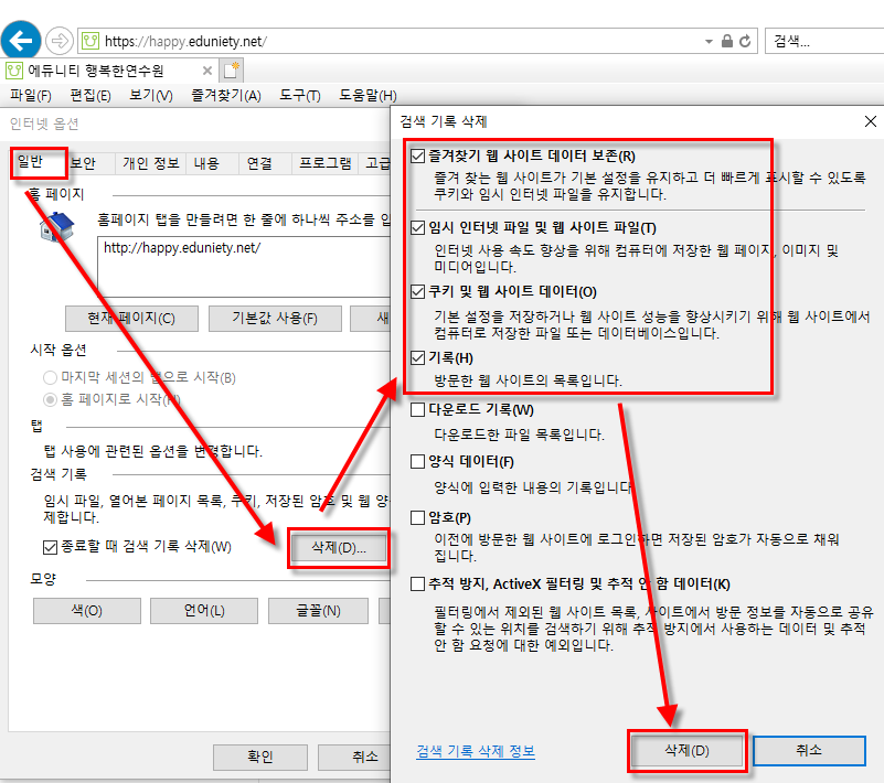 2) 도구 > 인터넷옵션 > 일반탭 > 검색 기록: 삭제 버튼 > 위에서 4개 항목 체크 후 삭제