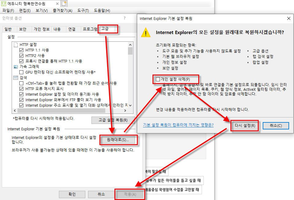 3) 도구 > 인터넷옵션 > 고급탭 > 원래대로 > 개인 설정 삭제 체크 > 다시 설정 > 적용